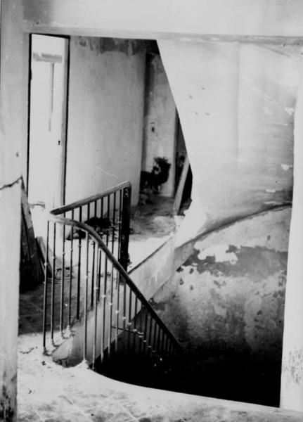 Dans la maison de gauche, la situation était beaucoup plus grave : toiture en partie démolie, de même que les dalles en dessous, ruinées par la pluie, façade Nord et apendice partiellement écroulées, petit escalier central mignon mais qui n'entrait pas dans les plans de partage de la maison, ....