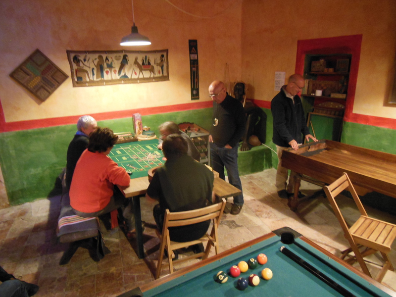 La salle compte un grand nombre de jeux anciens, autour d'un billard à palets, dont l'origine et la règle du jeu restent inconnus. Il y a aussi "Tonton", assis dans son coin, qui veille et s'occupe des cannes de billard, et puis une mutitude d'objets improbables qui confèrent àa cette salle son statut de cabinet de curiosités. des objets liés à l'histoire de la famille d'Eric Silvestre, pour beaucoup, et d'autres, achetés dans les vide-greniers.